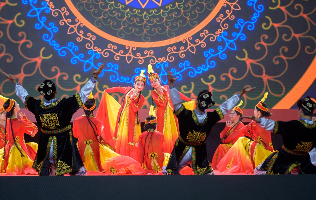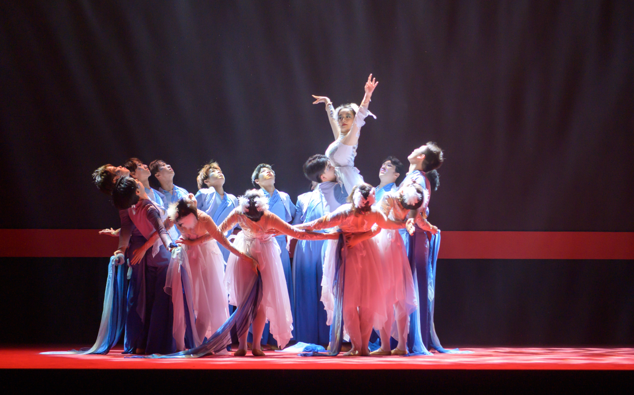 在“逐梦·青春”篇章中,徐悲鸿艺术学院的《暖·光》好似青春前行路上一束穿破黑暗的光芒,照亮整个舞台;外国语学院的《茉上繁星》,将芬芳玲珑的茉莉花与航天精神融合,引领青年改革创新;法学院的《方向》用纸飞机表现了青年跨越山海,抵达远方的奋进方向与理想;理学院的《绽放》通过传统维吾尔族舞蹈展示,传递出新时代中华各族儿女携手并进的磅礴力量。