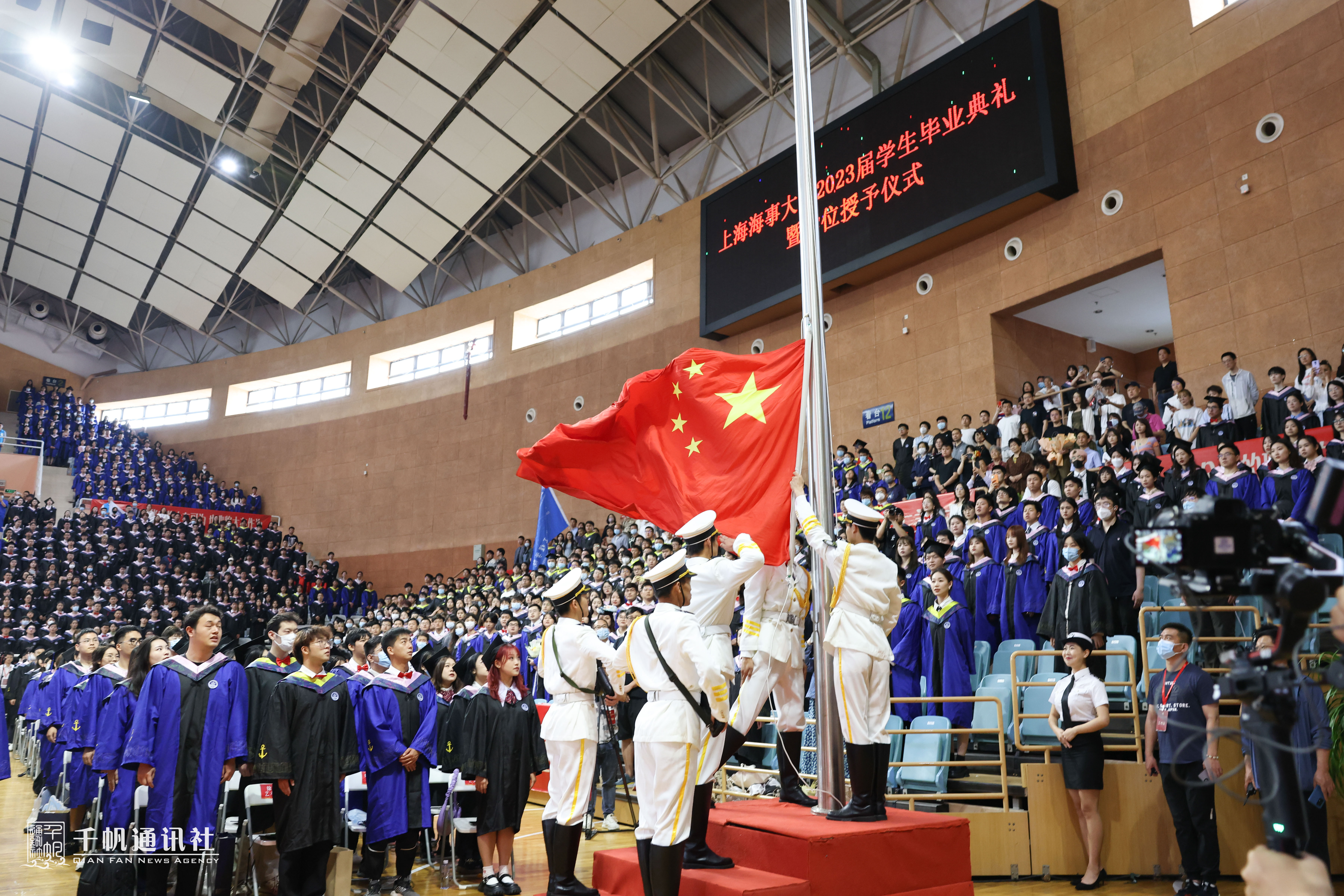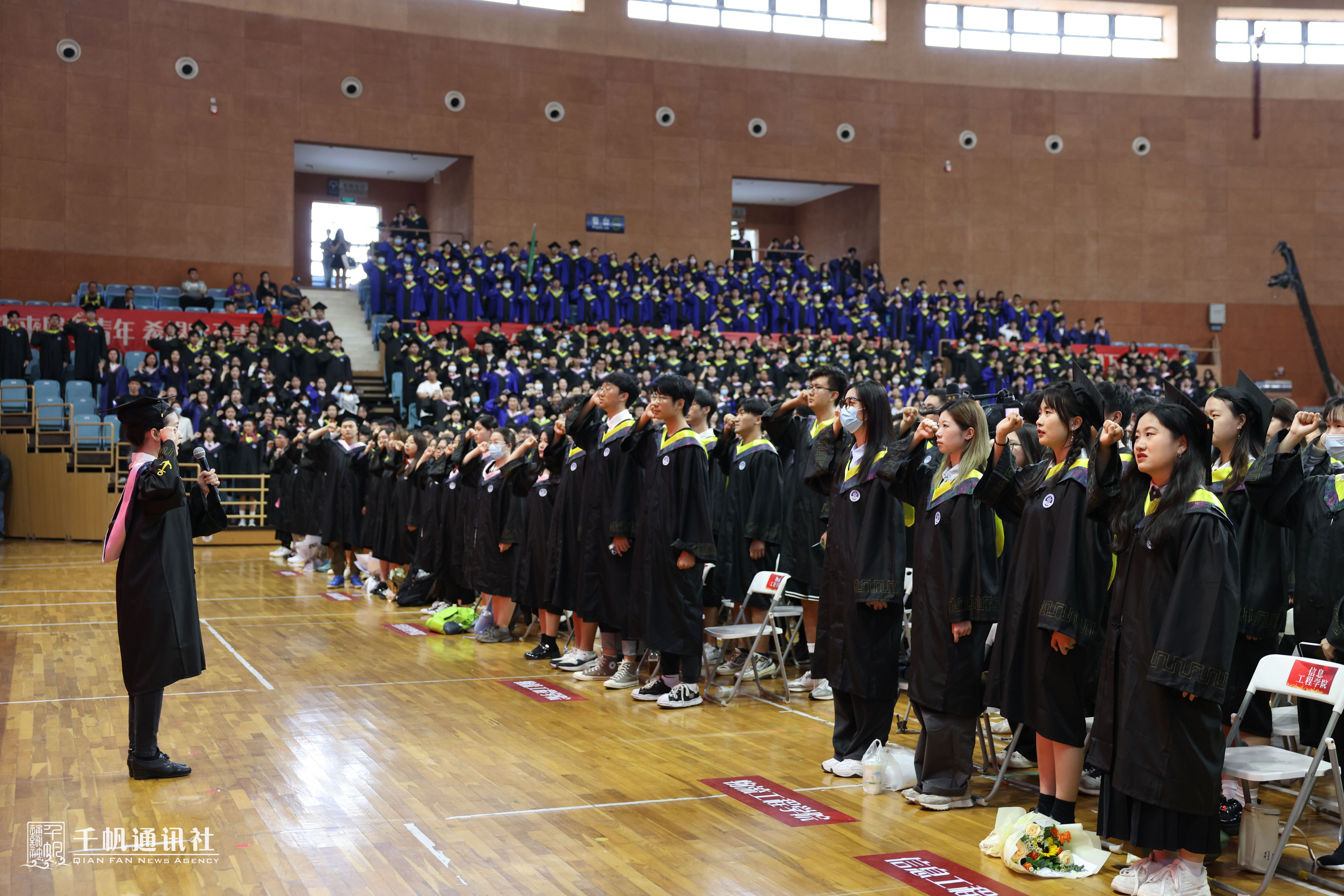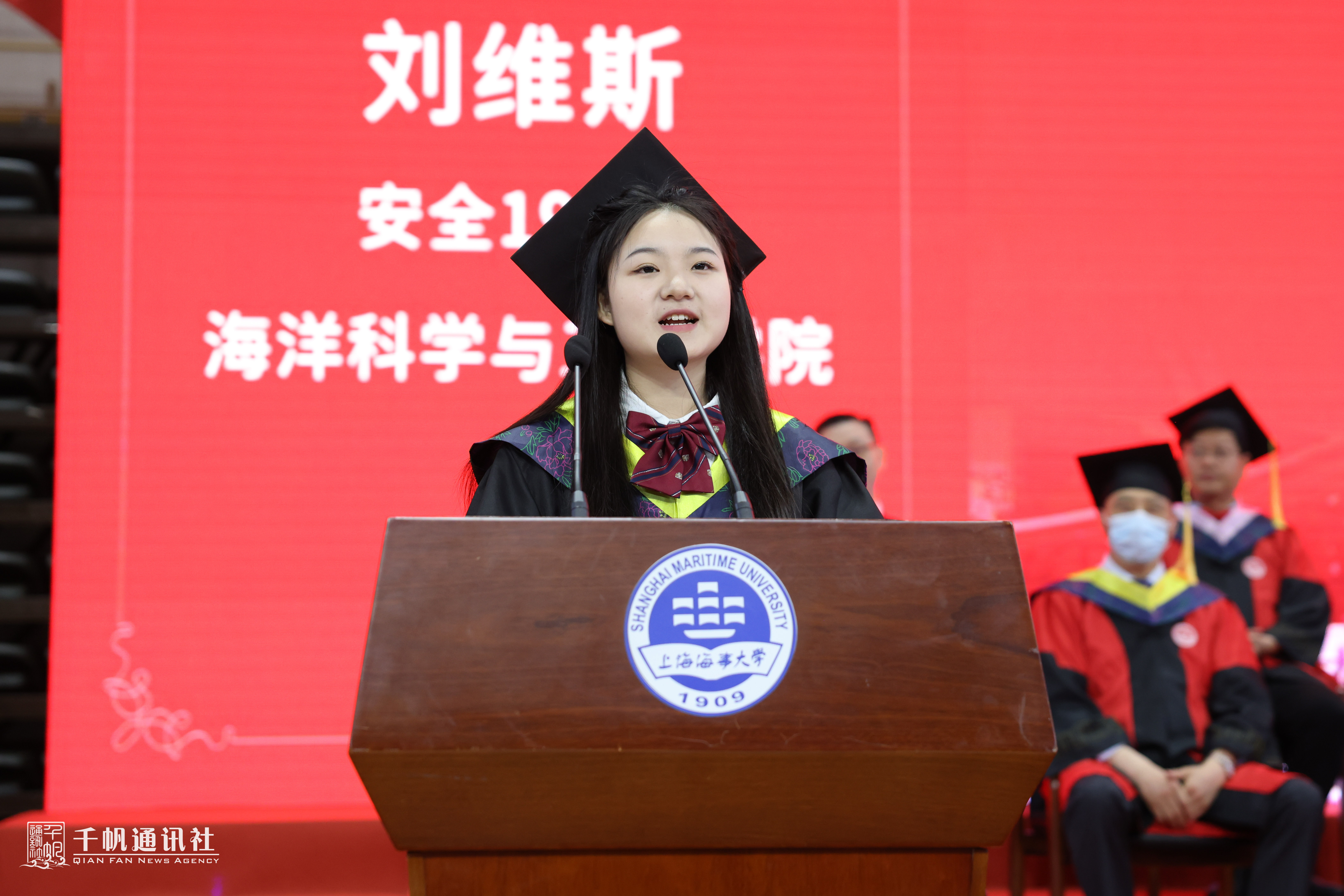 现场还举行了全体毕业生宣誓仪式,毕业生代表、外国语学院英航192班李婧袆同学领誓。全场毕业生起立,举起右拳庄严宣誓:“传承忠信笃敬校训精神,坚守海洋强国、航运强国理想,奋楫扬帆、破浪前行,为全面建成社会主义现代化强国奉献青春力量!强国有我,请党放心!”铿锵有力的誓词响彻全场,宣示了海大学子心系航运梦,激扬爱国情,立志为全面建设社会主义现代化国家新征程积蓄力量,破浪前行的远大理想!