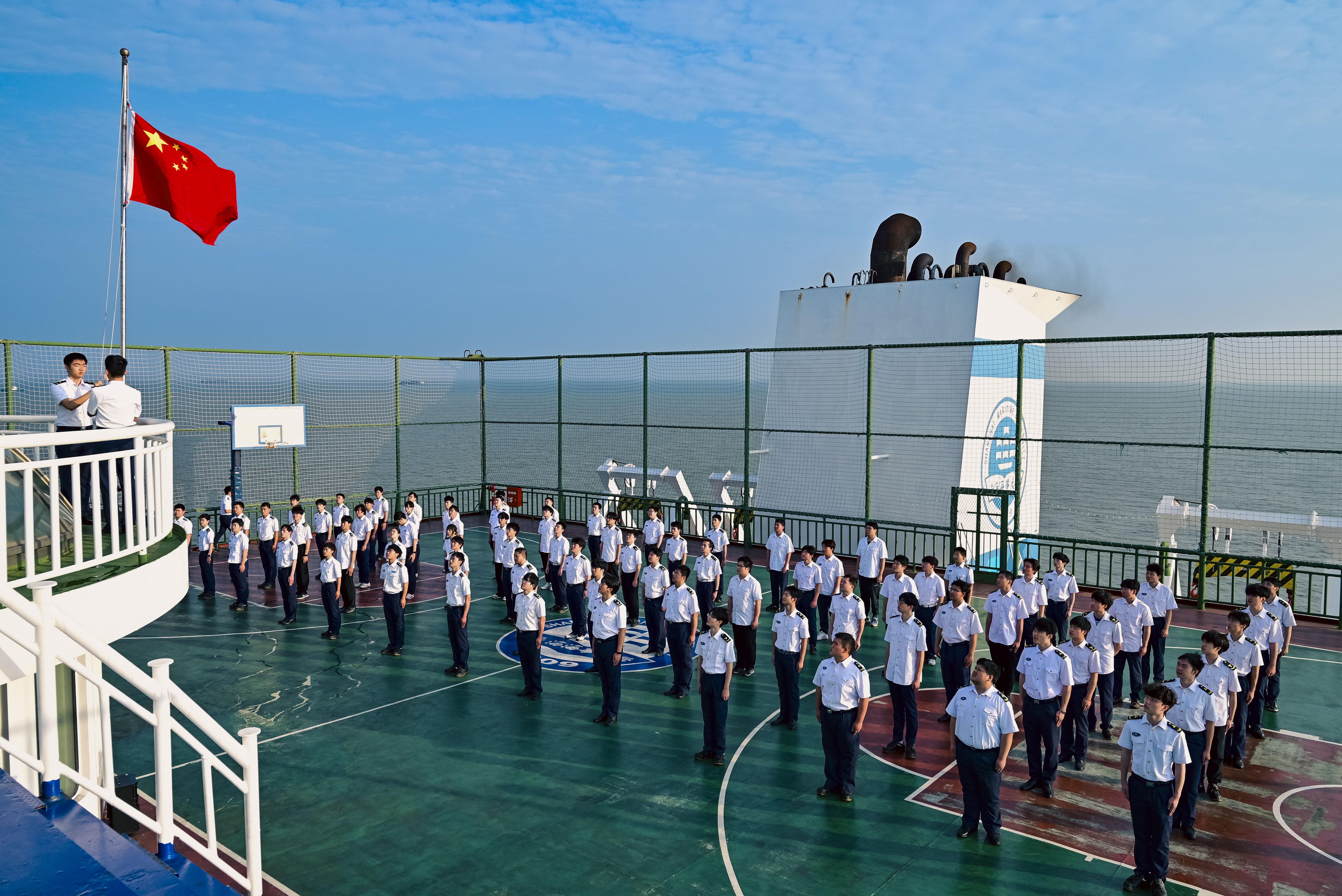 同时,“育明轮”航行实习的120名学生也在印度尼西亚巨港锚地举行了庆祝“世界海员日”的升旗仪式。上海海事大学旨在通过此次升旗仪式鼓励航海类专业学生坚定航海梦想,担负航海时代使命,激励同学们投身航运事业,为航运强国建设积蓄力量。