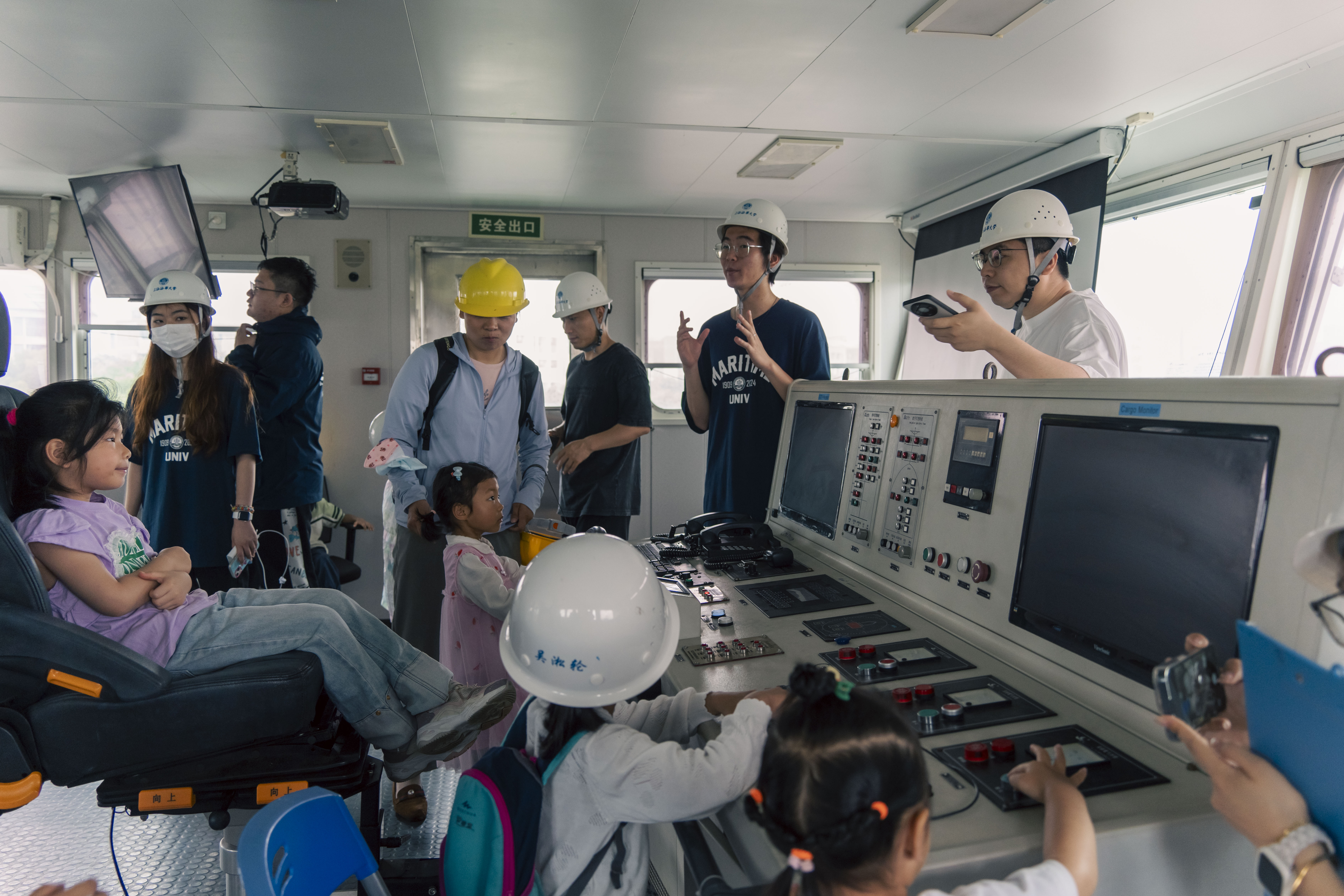 海音幼儿园的小朋友代表及其家长、上海海事大学附属北蔡高级中学的高三毕业生代表在志愿者的带领下走进海大校园,登上“吴淞”轮,穿梭于船舱之间,零距离体验航海的奥秘。