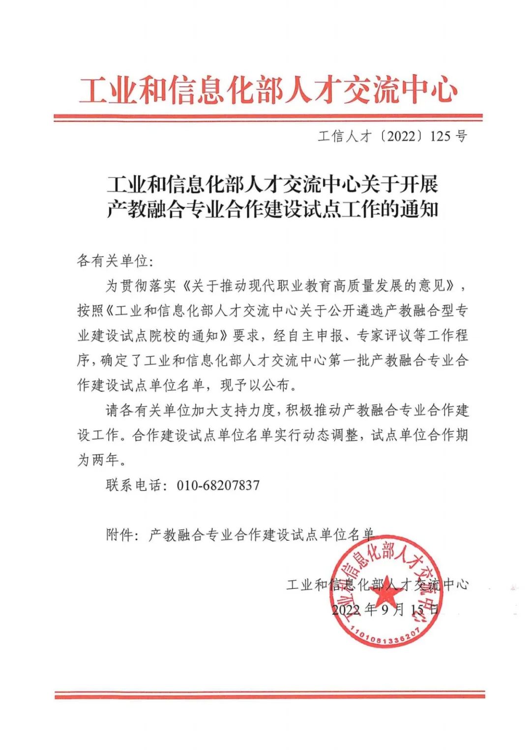 据悉,本次产教融合专业建设试点院校项目受到了广泛关注,全国共收到近700所院校1000多个专业申报。经自主申报、专家评议等环节,最终评选出23所本科院校、149所高职院校成为首批产教融合专业合作建设试点单位。工业和信息化部人才交流中心对产教融合专业合作建设试点单位实施动态调整机制,合作期为两年。