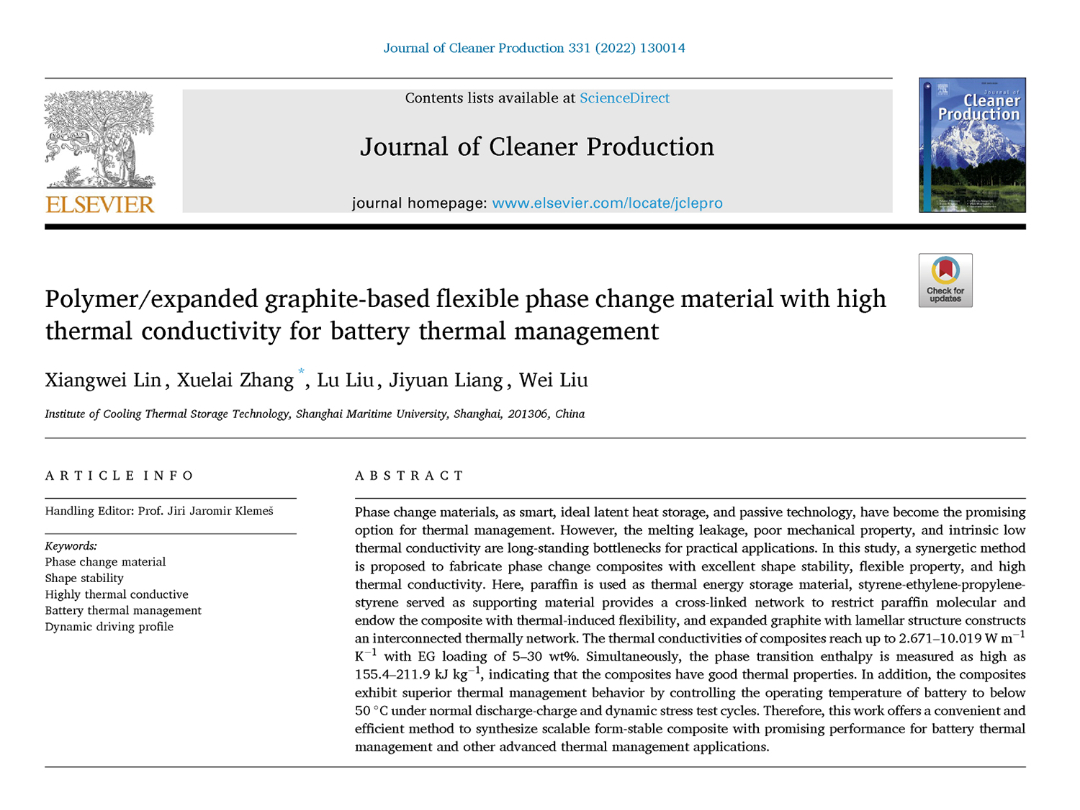 林祥伟和同学在章学来老师的指导下,基于相变冷却和电池热管理的研究发表的论文 :Polymer/expanded graphite-based flexible phase change material with high thermal conductivity for battery thermal management 于2022年被Journal of Cleaner Production杂志收录,影响因子(Impact Factor)达到9.297,在中科院标准下收录为一区刊物。