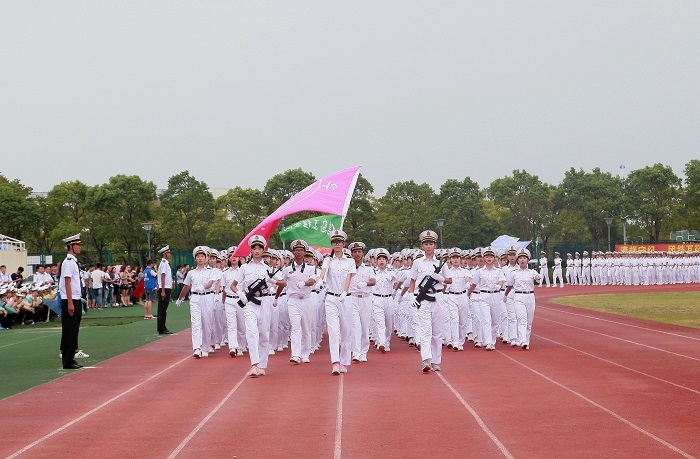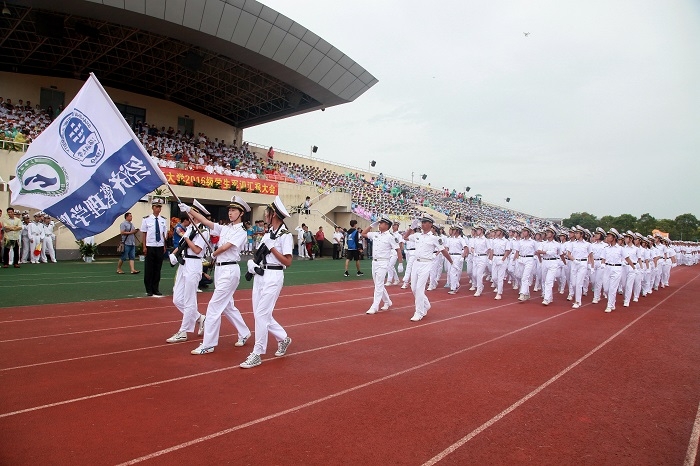 庄严的升国旗仪式后,伴随着雄壮激昂、壮观威严的解放军进行曲,黄有方校长在阅兵总指挥海军上尉朱云剑的陪同下,检阅了军训方队。随后,13个受阅方队和着有力的节拍,迈着矫健的步伐,喊着嘹亮的口号,斗志昂扬,英姿飒爽地依次走过主席台接受检阅,赢得现场观众阵阵掌声。