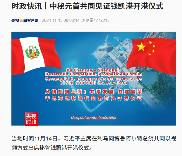 当地时间11月14日,中远海运港口秘鲁钱凯港举行开港仪式,习近平总书记和秘鲁博鲁阿尔特总统以视频方式共同出席。钱凯港是中秘共建“一带一路”重要项目,也是南美首个智慧港口。钱凯港一期工程可以将秘鲁到中国的海运时间缩短至23天,节约20%以上的物流成本,每年为秘鲁带来45亿美元收入。