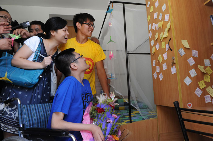 唐旭1991年4月出生于江苏宿迁,2岁时被确诊患上了当今世界五大绝症之一的重症进行性肌肉萎缩(俗称渐冻人),9岁起胸部以下几无知觉,仅右手食指稍能活动,被病症禁锢在轮椅上。他的家庭经济情况非常困难,父亲没有固定职业,母亲做家政,弟弟读职高,一家人在上海租住在20平米的房子里。在残酷的命运面前,他没有灰心和沉沦,付出超乎常人的努力,从上海安徽长淮民工子弟小学、长侨中学一直念到华东理工附属中学,最终在2011年以高出二本线55分的优异成绩考入我校信息工程学院计算机科学与技术专业。入学时,新华社、人民网、上海东方电视台等10余家媒体对其进行了跟踪采访和报道。