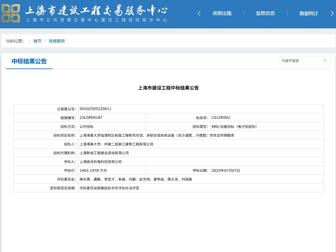 [中标结果公示]上海海事大学临港校区拓展工程新风空调、多联空调系统设备(含冷凝管、冷媒管)供货及伴随服务GCWC2025014